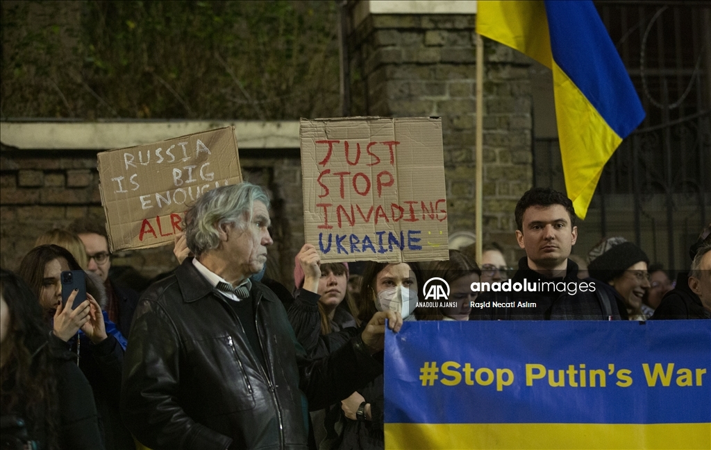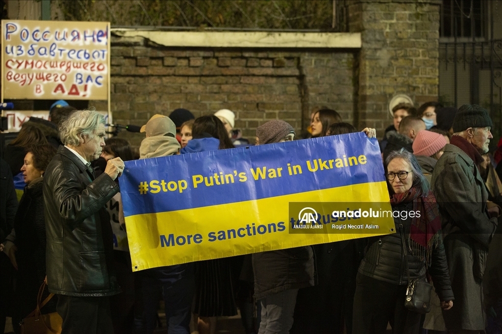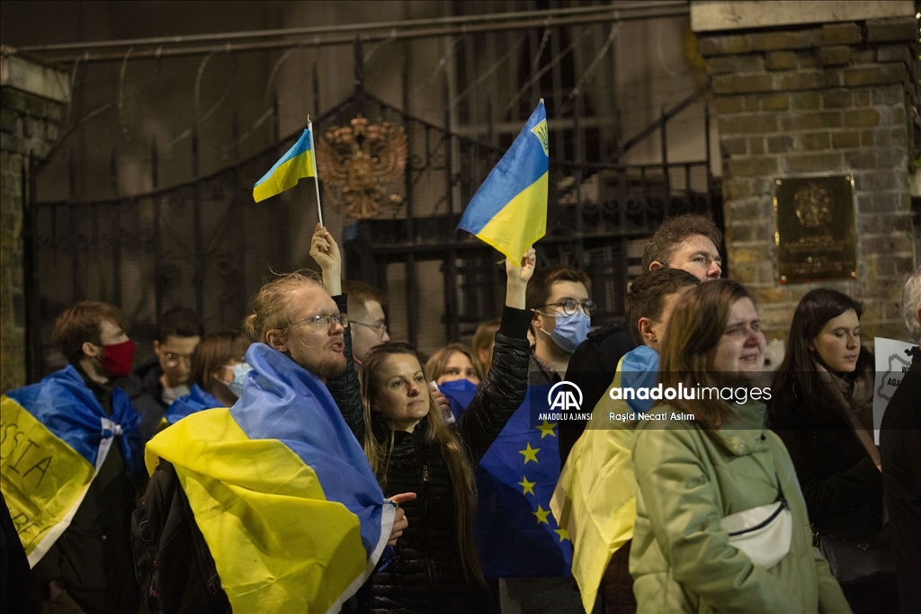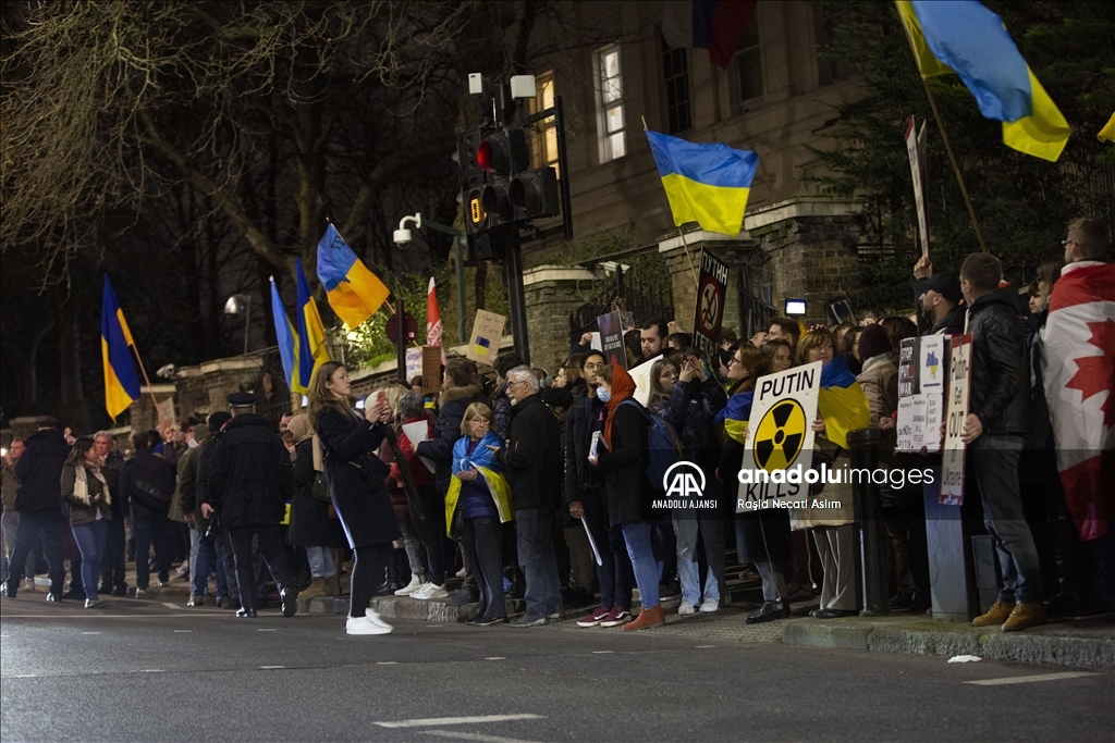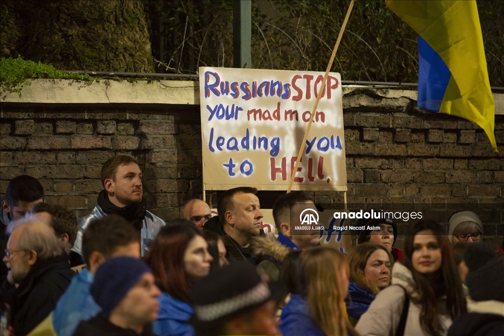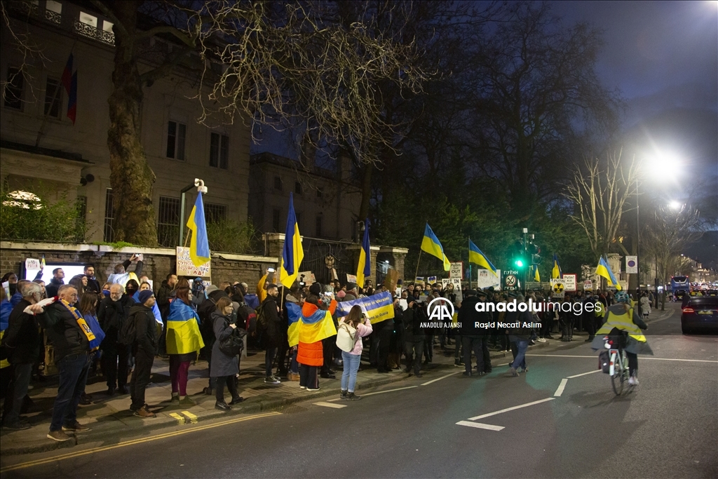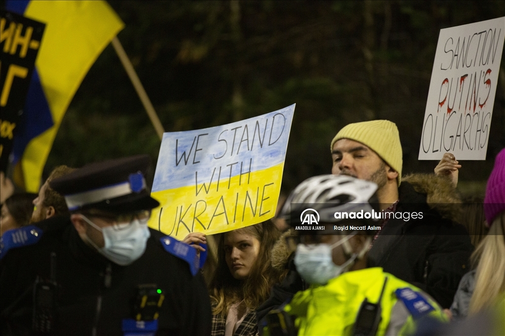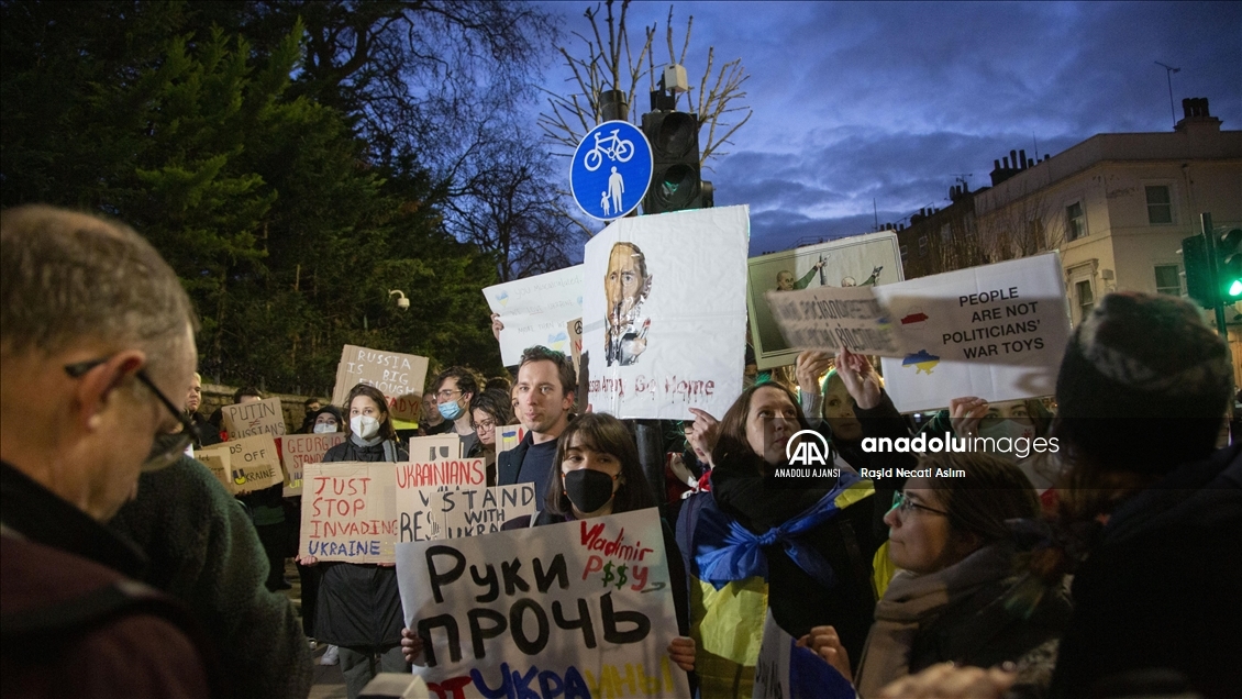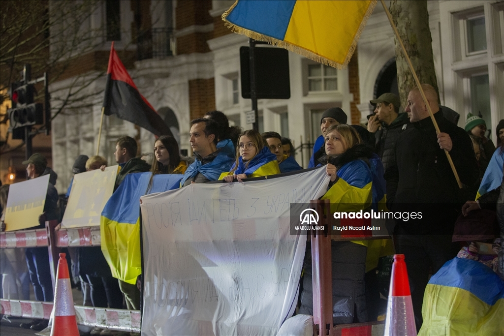 Rusya'nın Londra Büyükelçiliği önünde akşam saatlerinde bir araya gelen çok sayıda gösterici "Putin'i durdurun", "Ukrayna'ya özgürlük" ve "Ukrayna asla boyun eğmeyecek" yazılı pankartlar taşıdı.