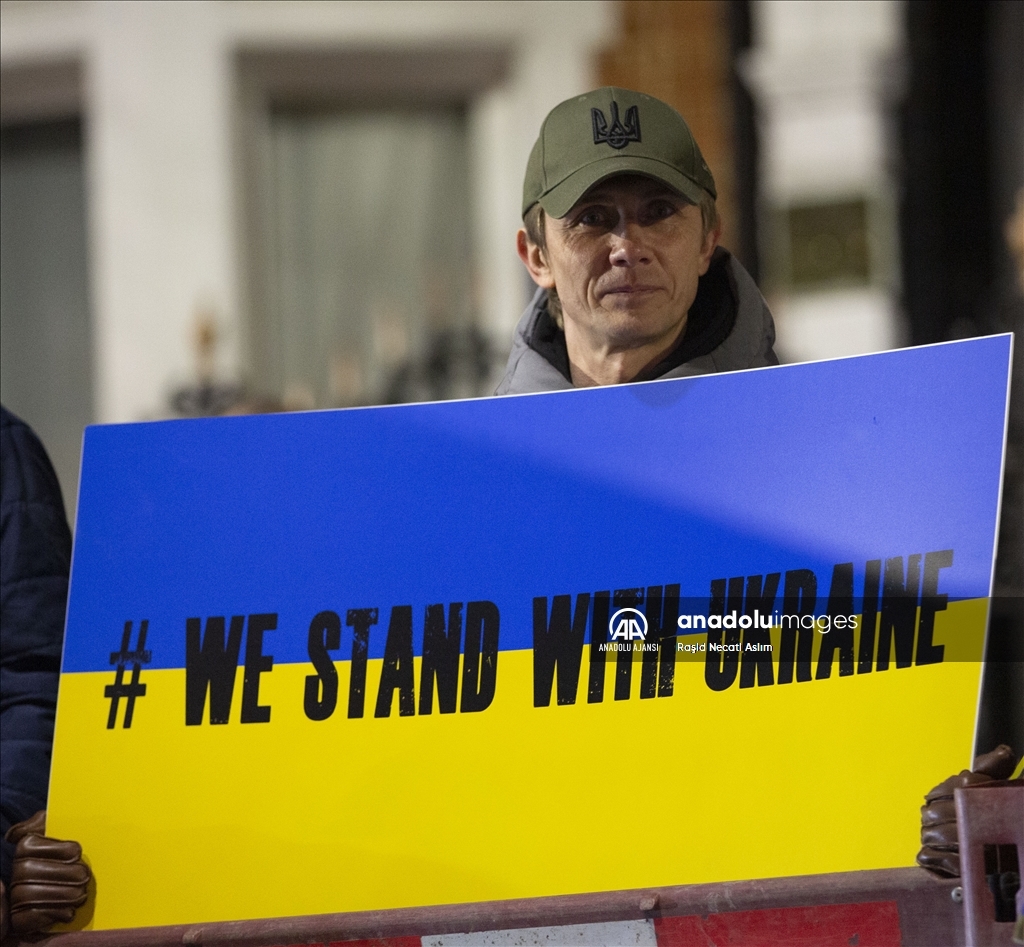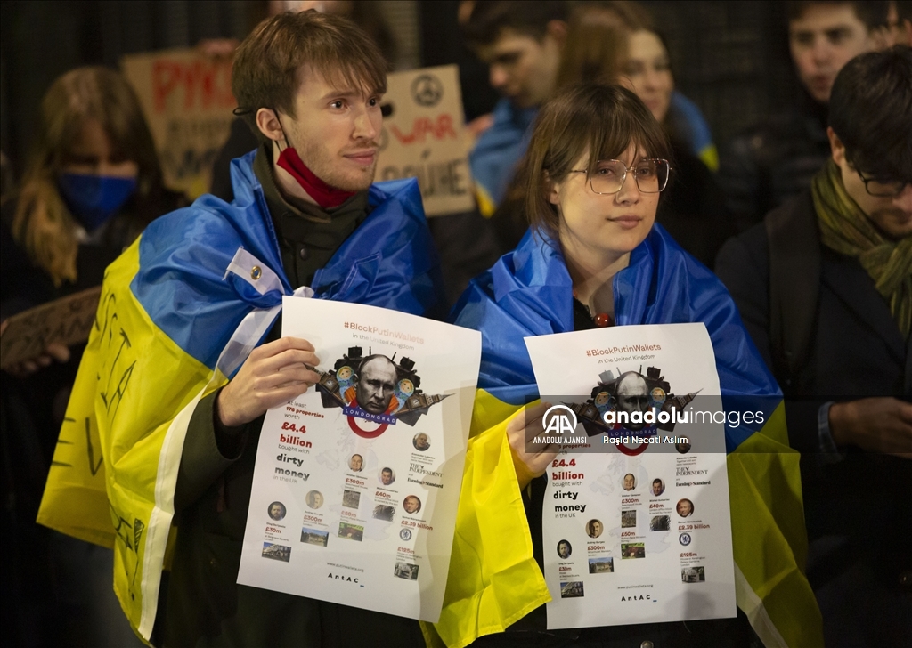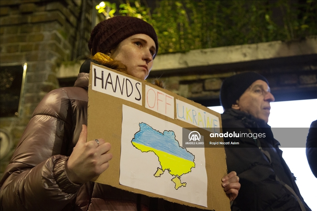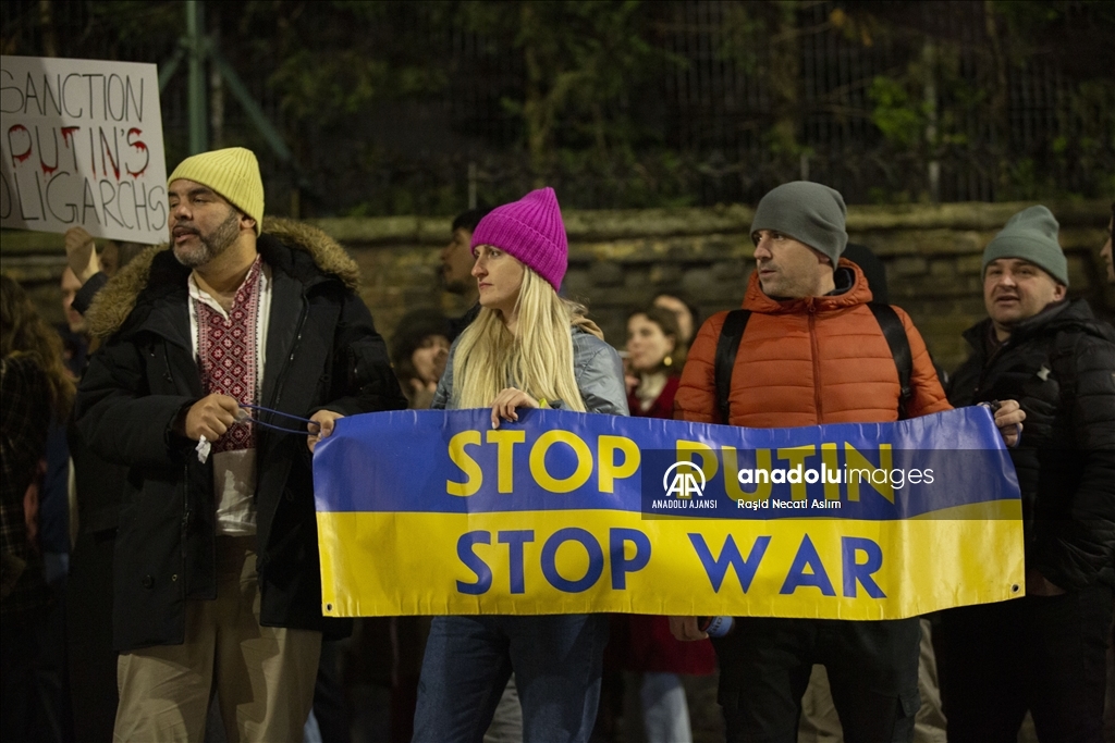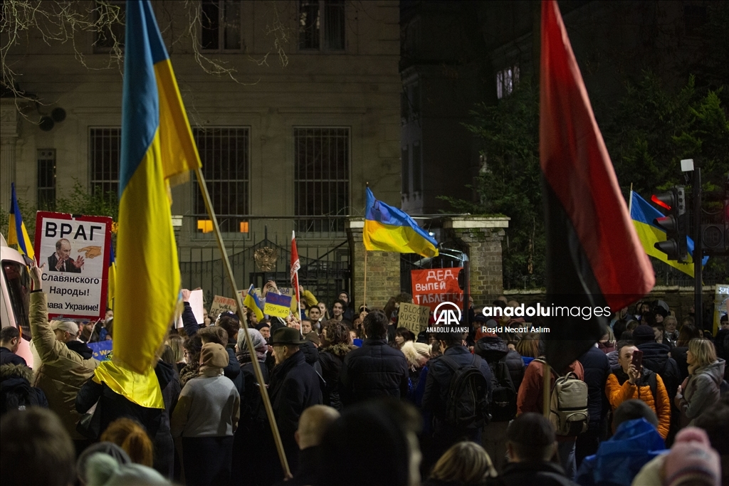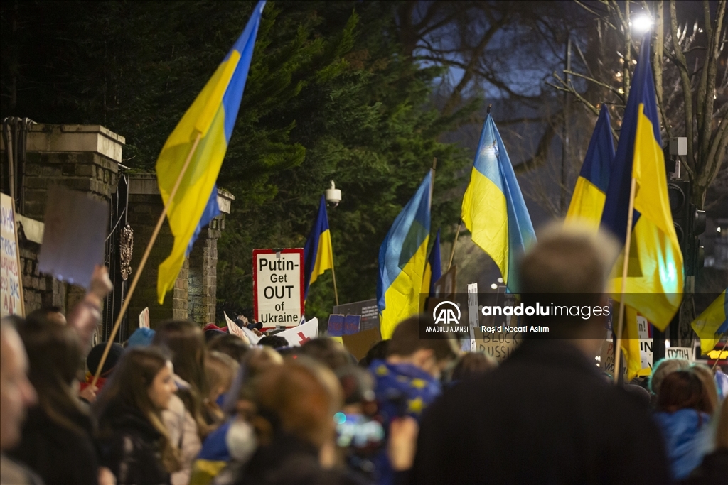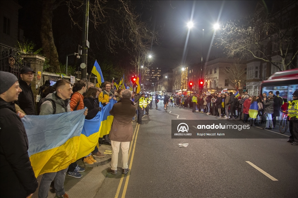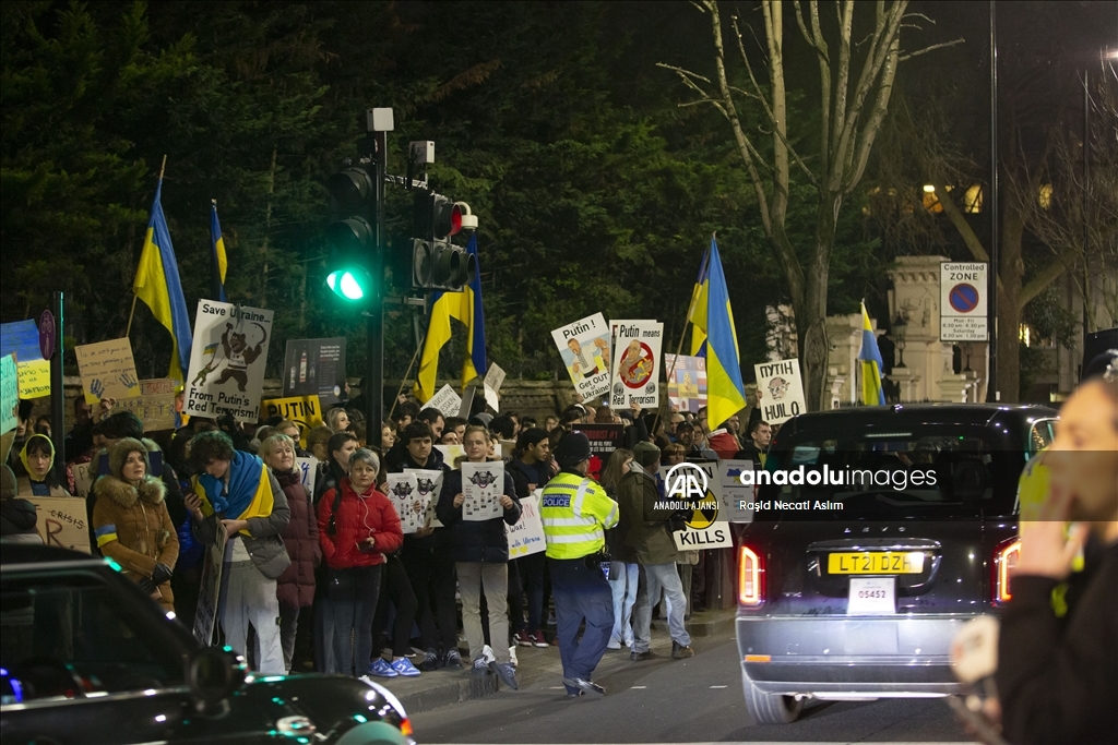 Rusya'nın Londra Büyükelçiliği önünde akşam saatlerinde bir araya gelen çok sayıda gösterici "Putin'i durdurun", "Ukrayna'ya özgürlük" ve "Ukrayna asla boyun eğmeyecek" yazılı pankartlar taşıdı.