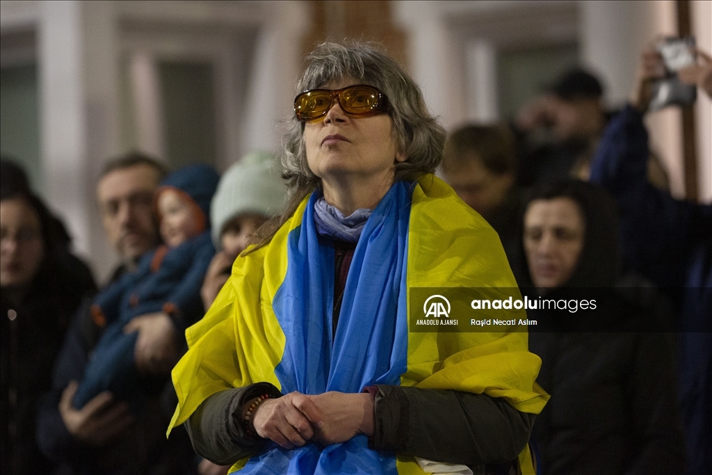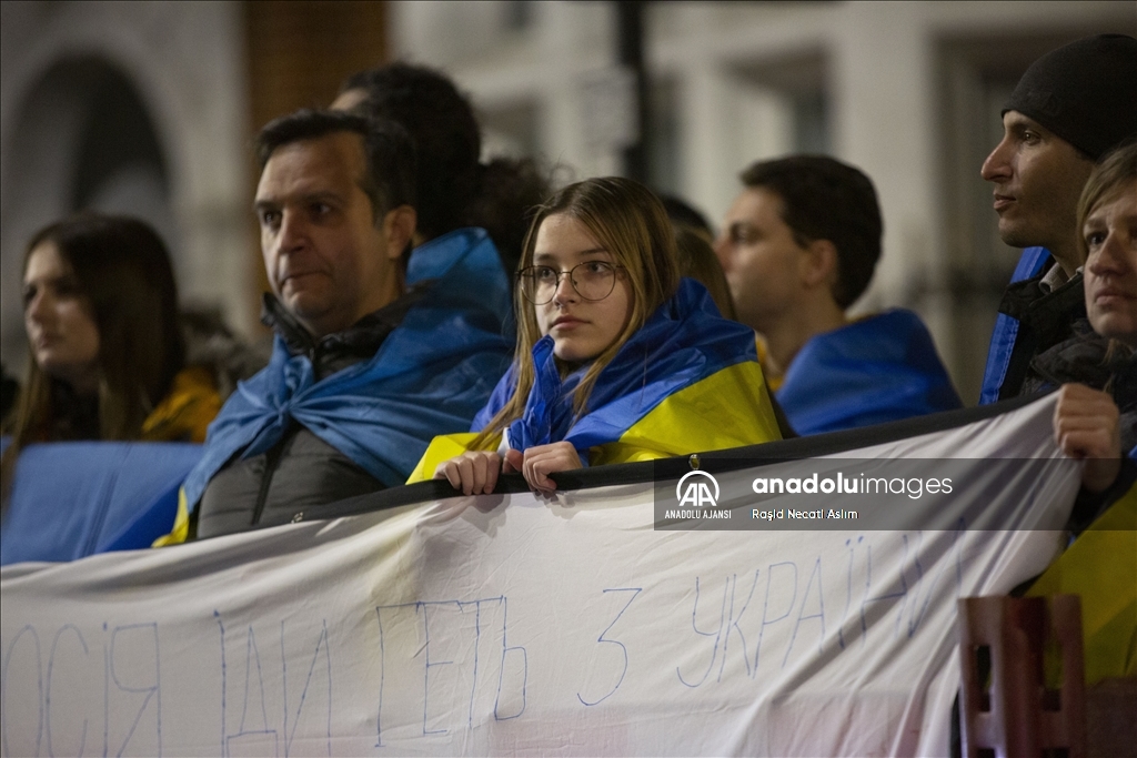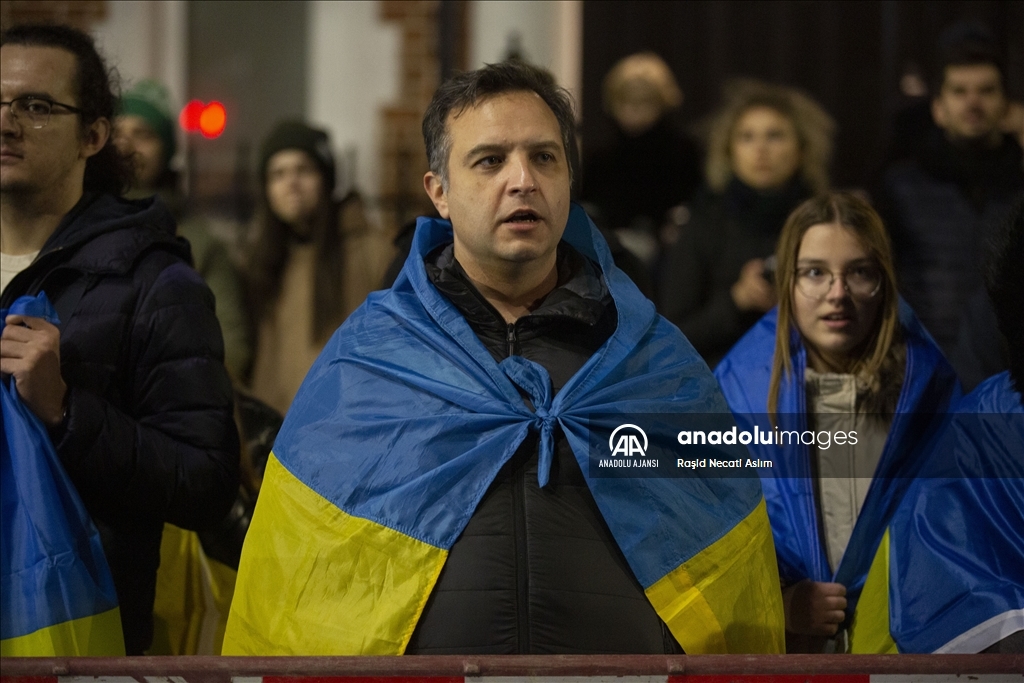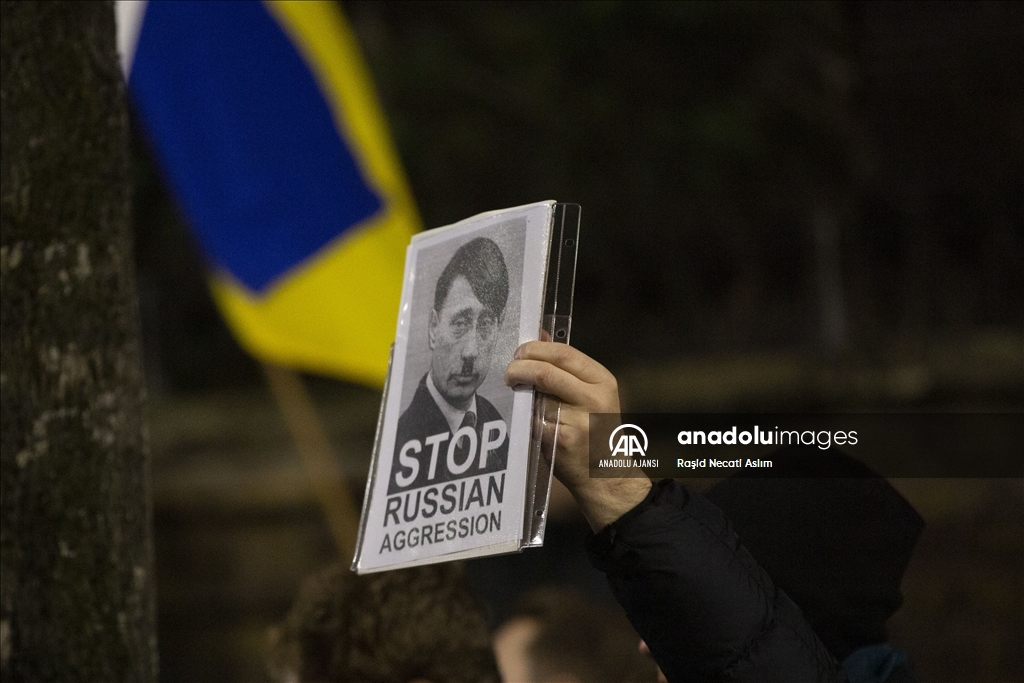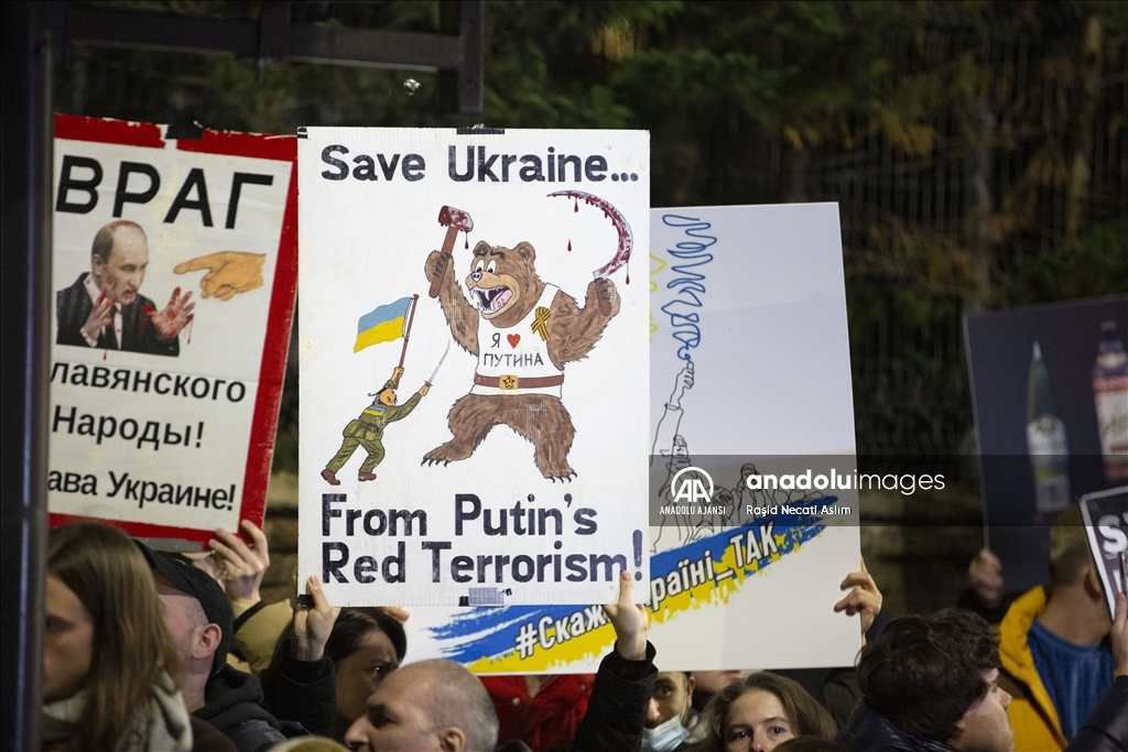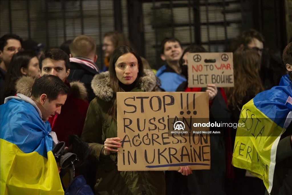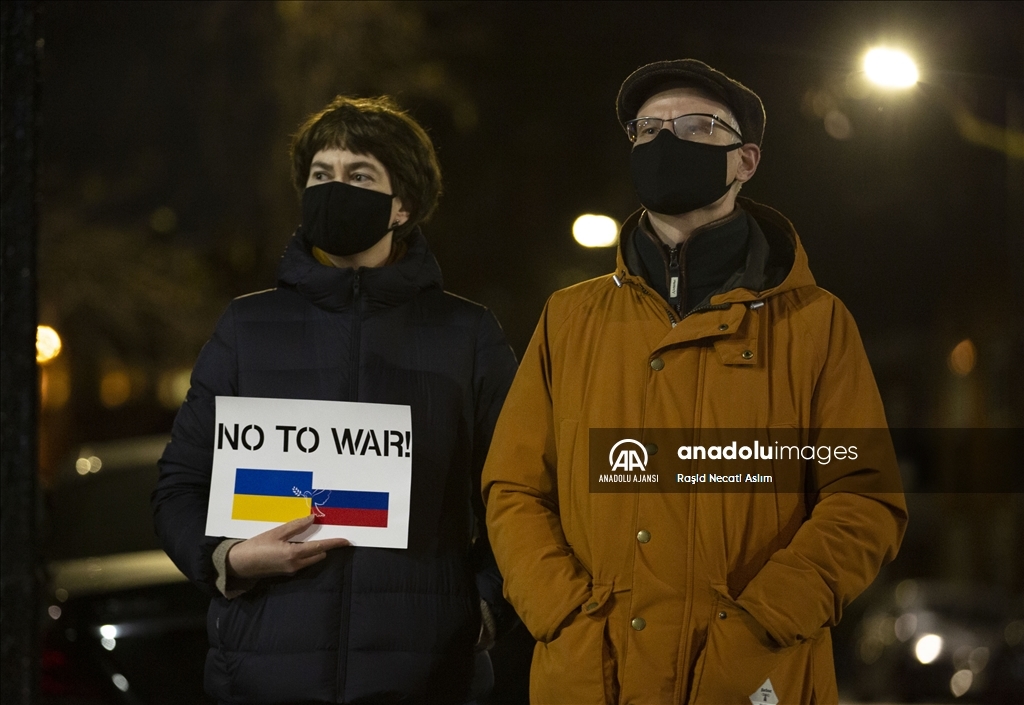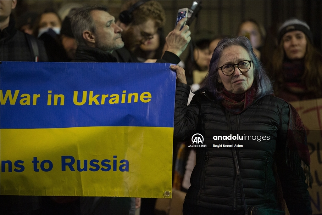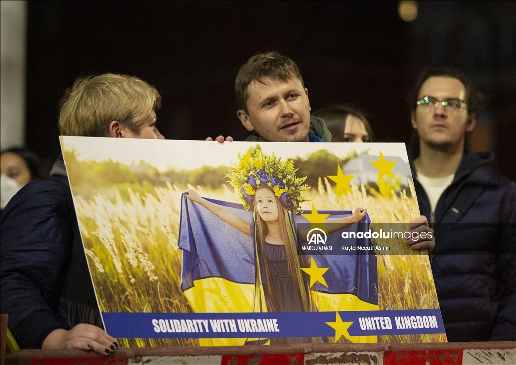 Rusya'nın Londra Büyükelçiliği önünde akşam saatlerinde bir araya gelen çok sayıda gösterici "Putin'i durdurun", "Ukrayna'ya özgürlük" ve "Ukrayna asla boyun eğmeyecek" yazılı pankartlar taşıdı.