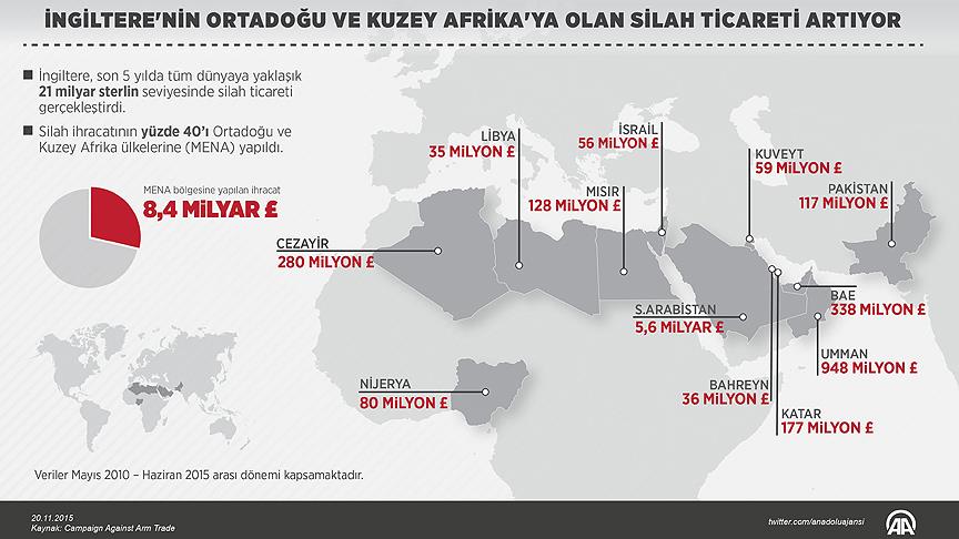 AA muhabirinin, merkezi Londra'da bulunan "Silah Ticareti Karşıtı Kampanya" (Campaign Against Arms Trade - CAAT) verilerinden derlediği bilgilere göre İngiltere, 2010 Mayıs ayında bu yılın haziran ayına kadar 5 yıllık dönemde tüm dünyaya yaklaşık 21 milyar sterlin seviyesinde silah ihracatı gerçekleştirdi. İngiltere’nin bu süreçte toplam silah ihracatının yaklaşık yüzde 40’ı Orta Doğu ve Kuzey Afrika ülkelerine (MENA) yapıldı. Son beş yıllık dönemde İngiltere’nin bölgesel gerilimin ve çatışmanın yoğun yaşandığı bu bölgelere silah ihracatı 8,4 milyar sterlini buldu.