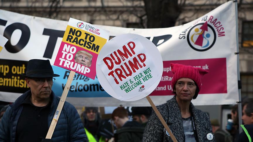 ABD Başkanı Trump'ın, 7 İslam ülkesinin vatandaşlarının ABD’ye girişini yasaklaması ile Meksika sınırına duvar inşası gibi politikalarının protesto edildiği ve İngiltere Başbakanı Theresa May'in Trump'ın politikalarına net tepki vermediği için eleştirildiği etkinlikte katılımcılar, "Trump'ı burada istemiyoruz" ve "Trump'a hayır" sloganları attı.