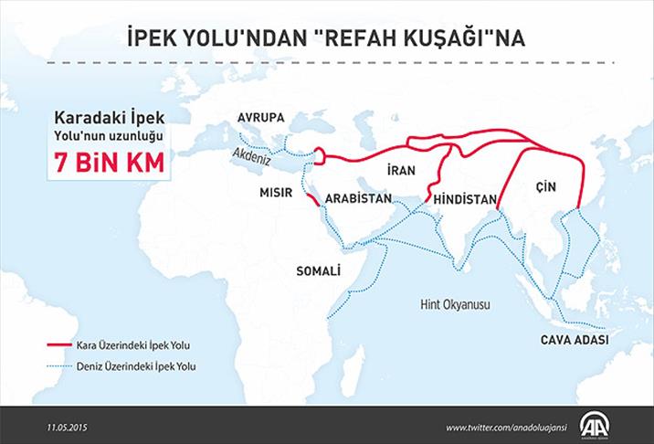 Çin Devlet Başkanı Şi Cinping'in, İpek Yolunun yeniden canlandırılmasına ilişkin, "İpek Yolu Ekonomik Kuşağı” ve "21. Yüzyıl Deniz Üzerindeki İpek Yolu” olarak gündeme getirdiği "Bir Kuşak Bir Yol” projesi, Doğu Asya ile Avrupa ekonomilerini birbirine bağlıyor. Proje, hattın 65 ülkeden geçmesini içeriyor ve ülkelerin toplam ekonomi büyüklüğü 21 trilyon doları buluyor.