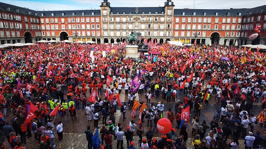 İşçi Komisyonları Sendikası (CCOO) ve Genel İşçi Sendikasının (UGT) çağrısıyla ülkenin dört yanından Madrid'e gelen işçiler, "Bu krizin faturasını işçi sınıfı ödemeyecek" ve "Ya maaş artışı, ya çatışma" şeklinde sloganlar attı.