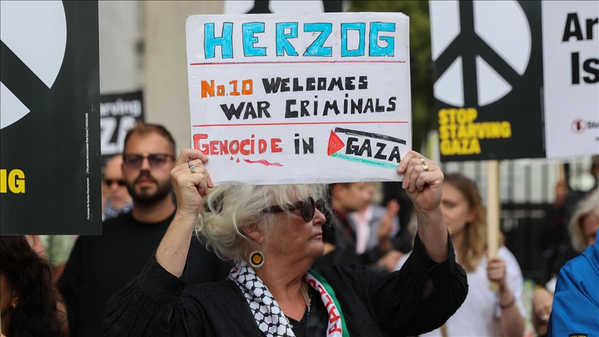 İsrail'in Gazze saldırılarına ve İngiltere'nin İsrail'e silah satışlarına tepki gösteren eylemciler, "Soykırım savunucusu Herzog", "Herzog, savaş suçlarından dolayı tutuklanmalı" ve "Herzog savaş suçlusu" pankartları taşıdı.