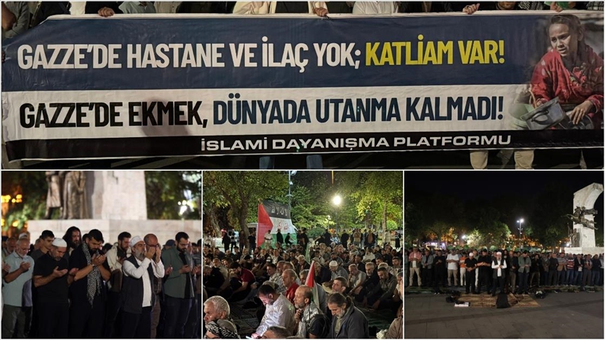 Fatih'teki Saraçhane Parkı'nda yatsı namazında toplanan katılımcılar Kur'an-ı Kerim okudu. Eylemde, İsrail'in saldırısı altındaki Filistin ve Gazzeliler için dua edildi.