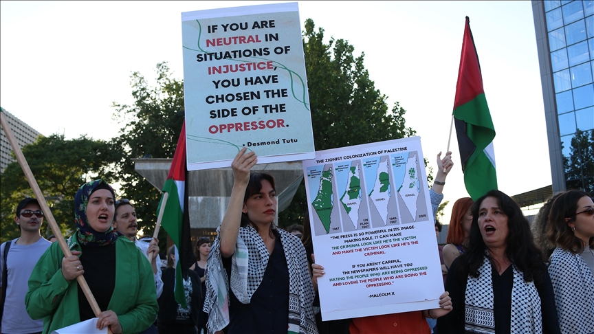 Priştine'nin merkezinde Başbakanlık binasının da bulunduğu İskender Bey Meydanı'nda toplanan bir grup, ellerinde Filistin bayrakları ve boyunlarına astıkları Filistin kefiyesi ile İsrail’in Filistin’e yönelik saldırılarını protesto etti.