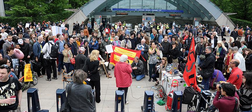 Yerel saatle 13.00'de toplanan yaklaşık 200 kişilik grup, kapitalizm karşıtı pankartlar açarak protesto gösterisinde bulundu. Canary Wharf'ta birçok banka ve yatırım şirketinin binasının bulunduğu meydanda toplanan kalabalığın protestosu sırasında yoğun güvenik önlemleri alındı.