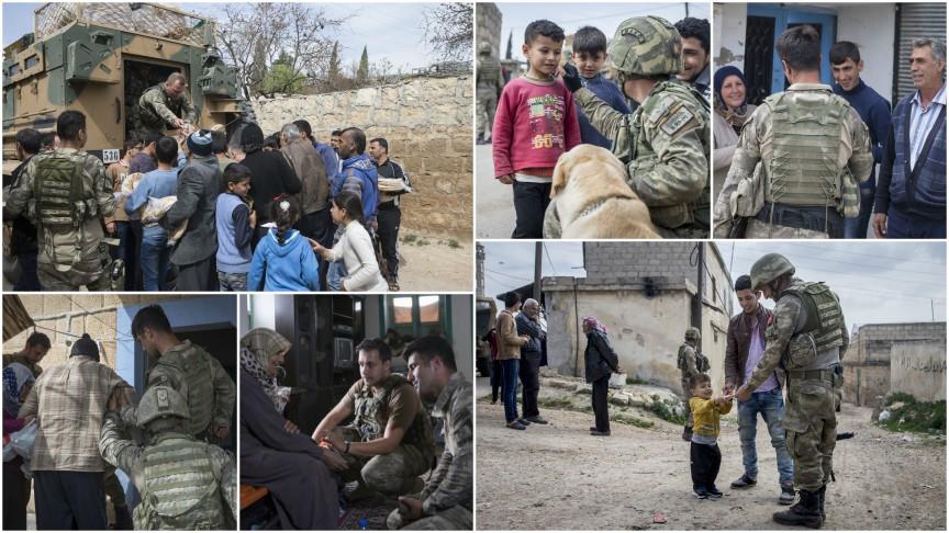 Mehmetçik, Zeytin Dalı Harekatı kapsamında teröristlerden arındırılan Afrin’de halka gıda yardımında bulundu, sağlık taraması yaptı.