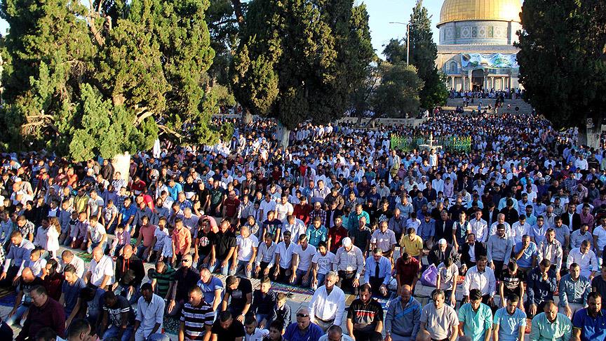 Kudüs'teki Müslümanlar bayram namazı için teşrik tekbirleriyle Mescid-i Aksa'ya akın etti.