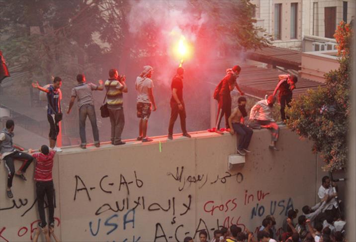 Protestocular, ABD'de yaşayan bir grup Kıpti tarafından çekilen ve Hz. Muhammed'e hakaret içeren sinema filmine tepki göstermek için ABD'nin Kahire Büyükelçiliği önünde toplandı. Eylemcilerden biri elçilik binasına tırmanarak Amerikan bayrağını indirdi. Kıptiler aleyhine slogan atan eylemciler, ABD bayrağını da yaktı.