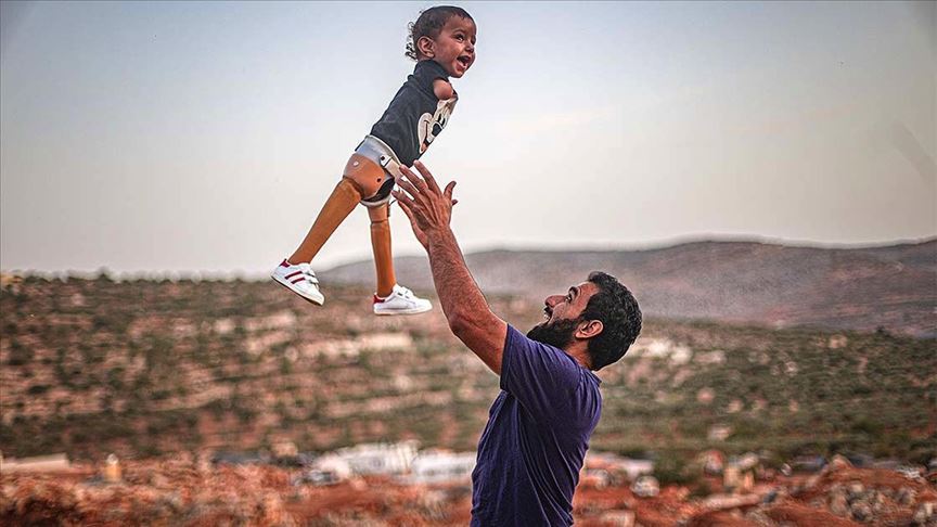 Doğuştan bacakları ve kolları olmayan 15 aylık Muhammed bebek, Türkiye'deki ilgili kuruluşların gözetiminde geçirdiği 7 haftalık adaptasyon sürecinin ardından protez bacaklarıyla İdlib'de sığındıkları çadırlarına geri döndü.