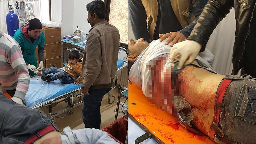 Terör örgütü PYD/PKK, Afrin'den Suriye'nin Türkiye sınırındaki Azez ilçesinde bir pazar yerine füze saldırısı düzenledi, biri ağır dört sivil yaralandı.