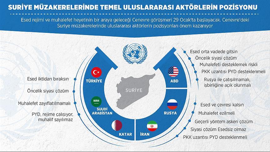 Suriye krizine çözüm bulmak amacıyla diplomasi trafiği hızlanırken, uluslararası aktörlerin pozisyonları önem kazanıyor. Türkiye, Katar ve Suudi Arabistan grubu masaya gerçek muhaliflerin oturmasını ve Esed'in iktidarını sonlandıracak bir takvimin hayata geçirilmesini isterken, ABD, Rusya'ya verdiği tavizlere rağmen Esed'in orta vadede yönetimi bırakmasını tercih ediyor. Rusya ve İran ise kendi aralarındaki bazı çıkar farklılıklarına rağmen, rejimi mutlak surette koruma çabasında.