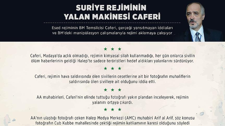 Suriye'de iç savaşın başladığı 2011 yılından beri "yalan makinesi" görevini üstlenen Esed rejiminin Birleşmiş Milletler (BM) Temsilcisi Beşşar Caferi, gerçeği yansıtmayan iddiaları ve BM'deki manipülasyon çalışmalarıyla rejimi aklamayı hedefliyor.