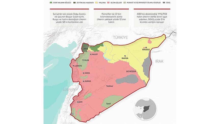 Suriye'deki Beşşar Esed rejimi, Rusya ve İran'ın desteğiyle ülkenin yüzde 58'ine hakim oldu. Muhaliflerin alanı yaklaşık yüzde 12'ye gerilerken, ABD destekli terör örgütü YPG/PKK ülkenin dörtte birini işgal ediyor.