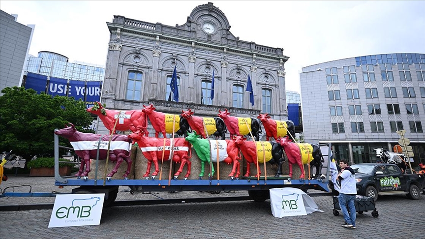 Avrupa ülkelerindeki süt üreticilerini temsil eden derneklerin çatı kuruluşu Avrupa Süt Kurulunun (EMB) çağrısıyla protestoya katılan çok sayıda kişi, Brüksel'deki Avrupa Parlamentosu (AP) önünde yer alan Lüksemburg Meydanı'nda bir araya geldi.
