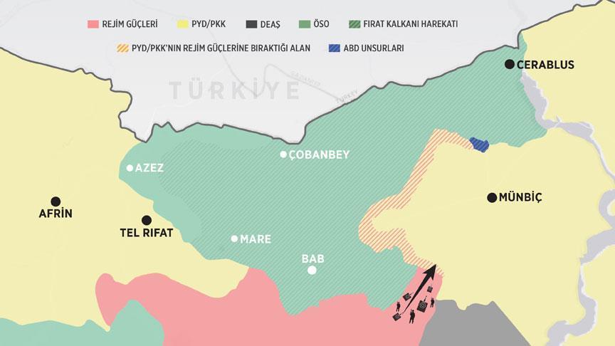 Mevcut durumda, Fırat Kalkanı Harekatı'nın hedefindeki Münbiç'in güneyi ve güneybatısı rejim güçleri; kuzeyi ABD tarafından çevrelenmiş durumda.