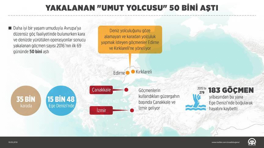 2016 yılının 69 gününde yapılan operasyonlarda, yasa dışı yollardan Avrupa'ya geçmeye çalışan 50 binden fazla göçmen yakalandı.