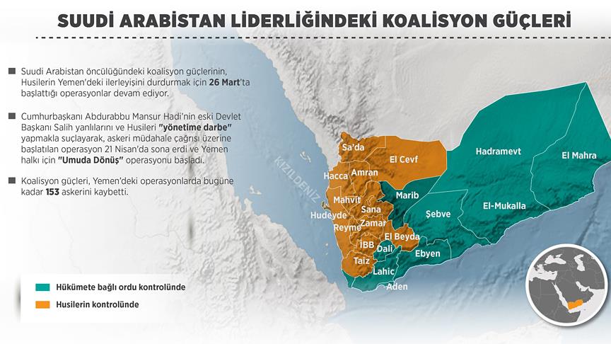 Suudi Arabistan öncülüğündeki koalisyon güçleri, Şii Ensarullah Hareketi'nin (Husiler) Yemen'deki ilerleyişini tam anlamıyla durduramamasına ve gücünü kıramamasına rağmen yaklaşık 8 aydır kara, hava ve denizden yürüttüğü askeri operasyonlarını sürdürüyor.