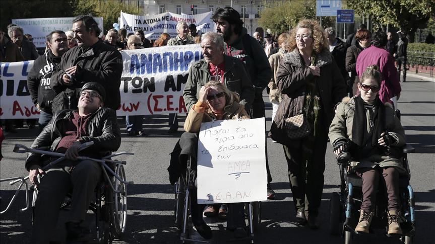 Başkentteki Sintagma Meydanı'nda bir araya gelen engelliler, kemer sıkma önlemlerinin yanı sıra Avrupa Birliği karşıtı slogan attı.