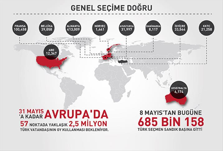 AA muhabirinin edindiği bilgiye göre, 7 Haziran genel seçimlerine günler kala Türkiye'nin dış temsilciliklerinde 685 bin 158 Türk seçmenin oy kullandığı belirtildi.