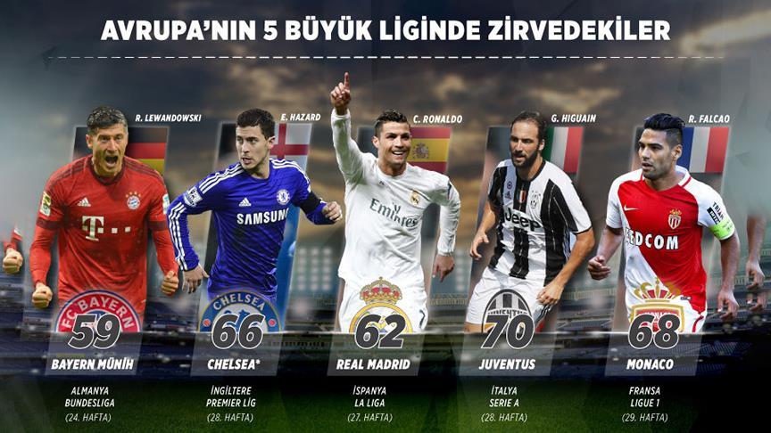 İngiltere'de Chelsea, Almanya'da Bayern Münih, İtalya'da Juventus, Fransa'da da Monaco, zirvedeki yerlerini korudu. İspanya'da ise Real Madrid, liderliği Barcelona'dan geri aldı.