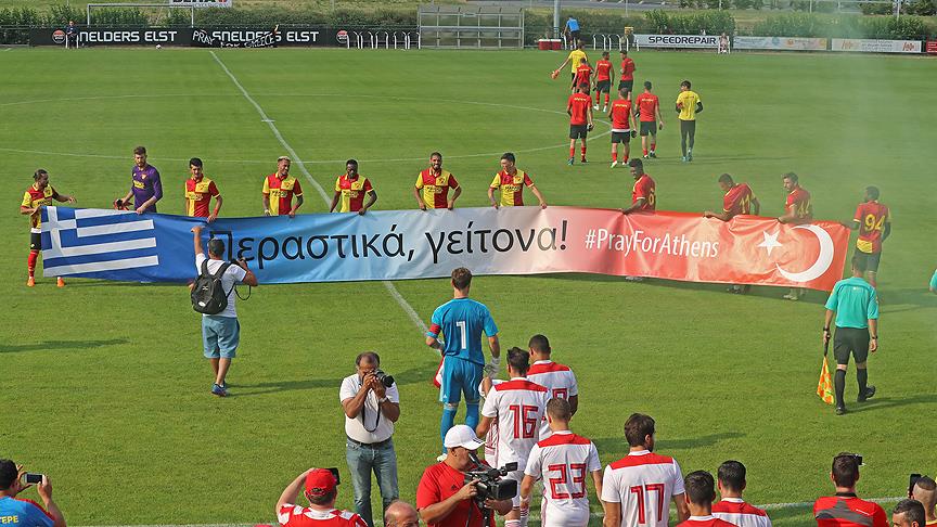 Hollanda'nın Arnhem bölgesinde oynanan maça İzmir ekibi, Yunanistan'ın başkenti Atina yakınlarında yaşanan yangın felaketi nedeniyle üzerinde Yunanca "Geçmiş olsun komşu" yazılı pankartla çıktı.