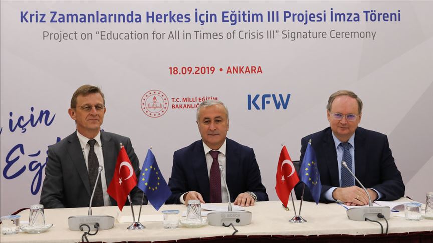 Milli Eğitim Bakan Yardımcısı Mustafa Safran, Avrupa Birliği (AB) Türkiye Delegasyonu Başkanı Büyükelçi Christian Berger, Alman Kalkınma Bankası (KFW) Avrupa ve Asya'dan Sorumlu Yönetim Kurulu Üyesi Stephan Opitz'in katılımıyla Milli Eğitim Bakanlığında, "Türkiye'deki Mülteciler için Mali Yardım Programı" kapsamındaki "Kriz Zamanlarında Herkes için Eğitim-III" projesi kapsamında sağlanan ek 100 milyon avroluk hibe için protokol imza töreni düzenlendi.
