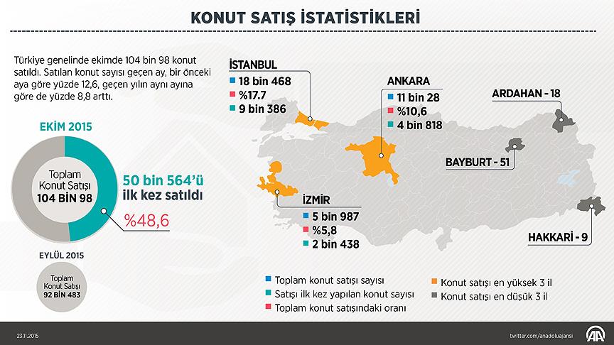 Buna göre, Türkiye genelinde satılan konut sayısı eylülde 92 bin 483 iken, geçen ay 104 bin 98'e yükseldi. İstanbul 18 bin 468 konut satışı ile en yüksek paya (yüzde 17,7) sahip oldu. Satış sayılarına göre İstanbul'u 11 bin 28 konut satışı (yüzde 10,6) ile Ankara, 5 bin 987 konut satışı (yüzde 5,8) ile de İzmir izledi. Konut satış sayısı düşük iller ise sırasıyla 9 konut ile Hakkari, 18 konut ile Ardahan ve 51 konut ile Bayburt oldu.