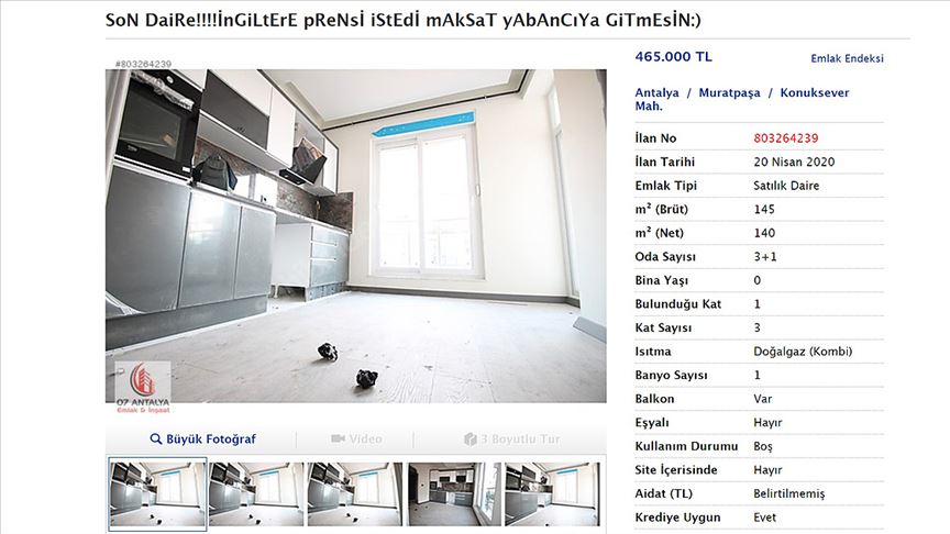 Antalya'daki bir emlak şirketinin e-ticaret platformlarında, "İngiltere prensi istedi vermedik, maksat yabancıya gitmesin", "Duyanlar duymayanlara söylemesin, başkası alır üzülür." gibi başlıklarla yayımladığı gayrimenkul ilanları, görenlerin dikkatini çekiyor.