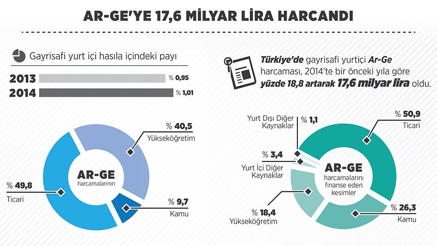 Türkiye'de gayrisafi yurtiçi Ar-Ge harcaması, 2014'te bir önceki yıla göre yüzde 18,8 artarak 17,6 milyar lira hesaplandı.