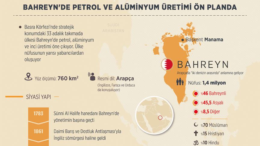 Cumhurbaşkanı Recep Tayyip Erdoğan'ın Körfez gezisi kapsamında ziyaret edeceği Bahreyn, 1,4 milyonluk nüfusunun yarısını yabancıların oluşturduğu 33 adalık takımada ülkesi. Petrol, alüminyum ve inci üretiminin öne çıktığı Bahreyn, Basra Körfezi'ndeki stratejik konumu ile de dikkat çekiyor.