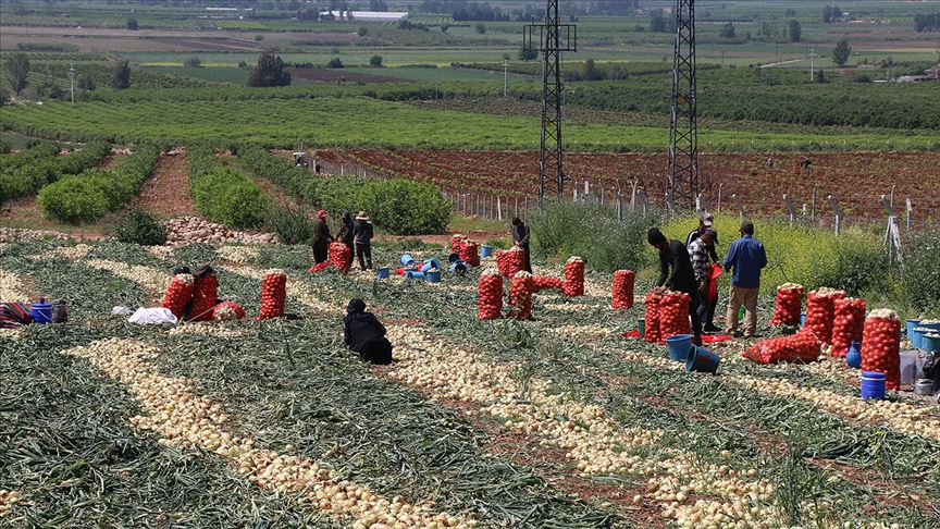 Hasat sezonu dolayısıyla tarlaları dolduran işçiler, yoğun bir çalışmayla topladıkları soğanları paketliyor.