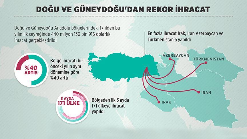 Doğu ve Güneydoğu Anadolu bölgelerindeki 17 ilden, bu yılın ilk çeyreğinde 440 milyon 136 bin 916 dolarlık ihracat yapıldı.