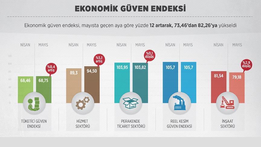 Buna göre, ekonomik güven endeksi, mayısta geçen aya göre yüzde 12 artarak 73,46 değerinden 82,26 değerine çıktı. Ekonomik güven endeksindeki artış, hizmet sektörü ve tüketici güven endekslerindeki artışlardan kaynaklandı.