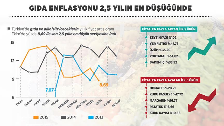 Merkez Bankasının, Ekim Ayı Fiyat Gelişmeleri Raporu'na göre, yıllık tüketici enflasyonunun yüzde 7,58’e gerilemesinde, yıllık gıda enflasyonundaki yavaşlama ile enerji fiyatlarındaki baz etkisi belirleyici oldu. Ekimde gıda ve alkolsüz içecekler grubunda yıllık enflasyon yaklaşık 2 puanlık düşüşle yüzde 8,69'a geriledi. Mevsimsel etkilerden arındırılmış işlenmemiş gıda fiyatlarında sebze ürünlerine bağlı olarak kaydedilen azalış bu gelişmede temel belirleyici oldu. Böylelikle işlenmemiş gıda grubu yıllık enflasyonu 3,83 puan azalışla yüzde 9,40'a düştü.