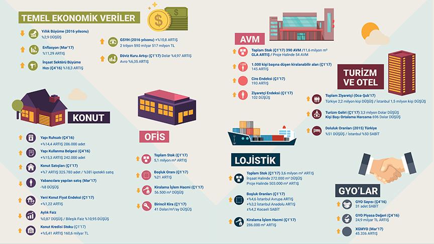 "Doğrudan yabancı yatırımlar ve yabancılara gayrimenkul satış rakamlarında yaşanan düşüş 2016 yılından bu yana devam etti. Yabancılara yapılan konut satışları bir önceki yılın aynı dönemine göre yüzde 8 azaldı. Yabancıların Türkiye'de yaptıkları yatırımlar; alan bazında 2017'nin ilk üç ayında, 2016'nın aynı dönemine göre yüzde 17,1 artış, işlem sayısında ise yüzde 13,4 azalış gösterdi. Türkiye genelinde toplam AVM sayısı 390'a, toplam kiralanabilir alan stoku ise yaklaşık yüzde 5’lik artış ile 11 milyon 600 bin metrekareye ulaştı. Bu rakam, İstanbul'un toplam kiralanabilir alan stokunun yaklaşık yüzde 38'ini oluşturdu."