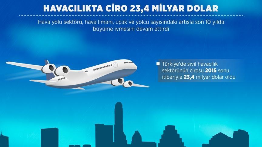 Havayolu işletmeleri, hava alanı işleticileri, bakım, eğitim, yer hizmetleri kuruluşlarından oluşan sivil havacılık sektörünün toplam cirosu geçen yıl sonu itibarıyla 23,4 milyar dolar, sektörde görev yapan personel sayısı 191 bin 716 oldu.