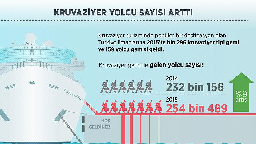AA muhabirinin Ulaştırma, Denizcilik ve Haberleşme Bakanlığı Deniz Ticareti Genel Müdürlüğü verilerinden yaptığı derlemeye göre, 2015 yılında Türkiye'deki 23 limana bin 296 kruvaziyer tipi gemi ve 159 yolcu gemisi demirledi.