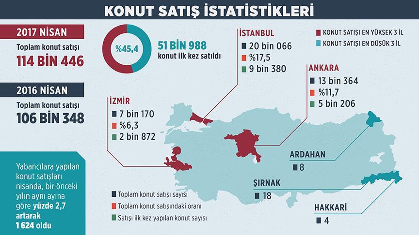 İstanbul 20 bin 66 konut satışıyla en yüksek paya (yüzde 17,5) sahip oldu. Satış sayılarına göre İstanbul'u, 13 bin 364 konut satışıyla (yüzde 11,7) Ankara, 7 bin 170 konut satışıyla (yüzde 6,3) İzmir izledi.