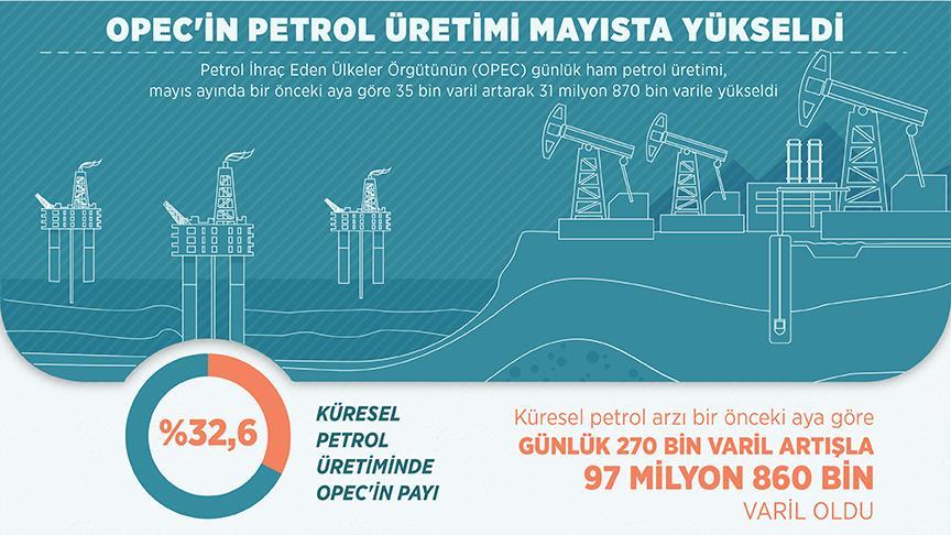 OPEC'in ham petrol üretimi ise geçen ay bir önceki aya göre günlük 35 bin varil artarak 31 milyon 870 bin varil olarak gerçekleşti. OPEC'in üretimini kısmasıyla mayısta küresel petrol üretimi içindeki payı yüzde 32,6 oldu.