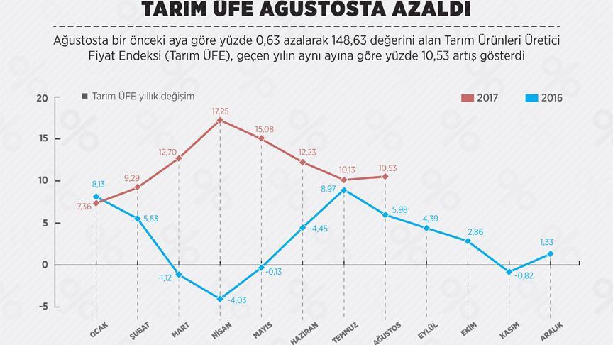 Buna göre, ağustosta bir önceki aya göre yüzde 0,63 azalarak 148,63 değerini alan Tarım ÜFE, geçen yılın aynı ayına göre yüzde 10,53 artış gösterdi. Tarım ÜFE, 12 aylık ortalamalara göre de yüzde 8,51 arttı.