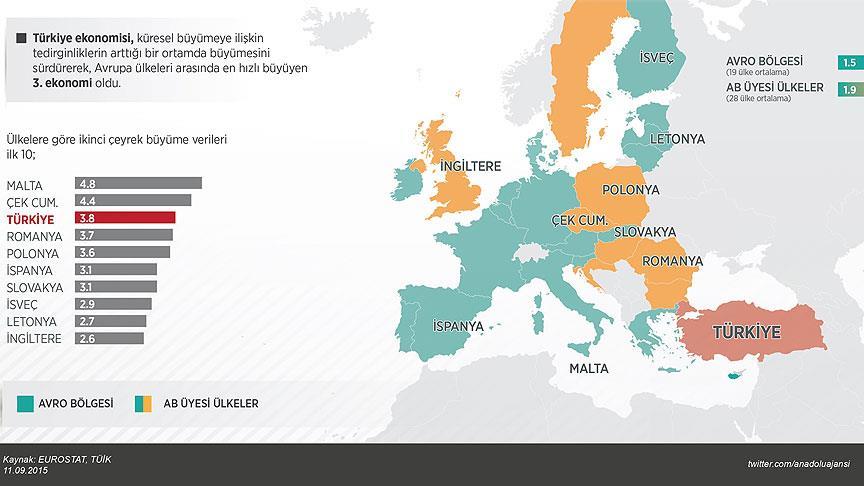 AA muhabirinin Türkiye İstatistik Kurumu (TÜİK) ve Avrupa İstatistik Ofisi'nden (Eurostat) derlediği verilere göre, Türkiye ekonomisi yılın ikinci çeyreğinde geçen yılın aynı dönemine kıyasla yüzde 3,8 ile beklentilerin üzerinde büyüdü. Aynı dönemde, 28 üyeli Avrupa Birliği (AB) ve 19 üyeli Avro Bölgesi'nde ortalama büyüme sırasıyla yüzde 1,9 ve yüzde 1,5 düzeyinde gerçekleşti.