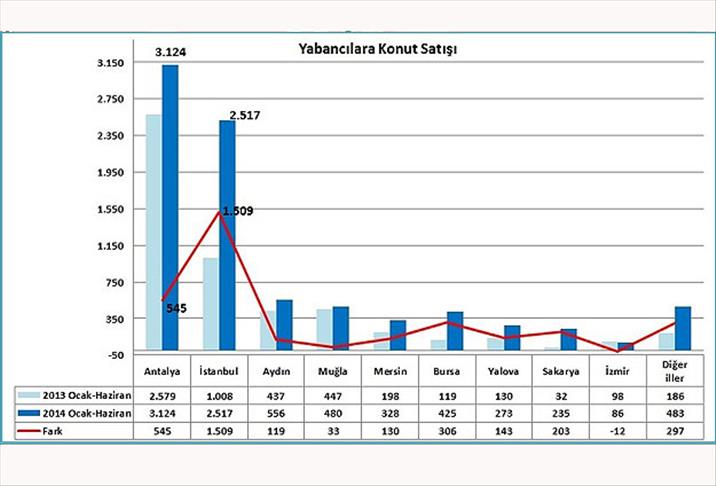 İlk 6 ayda yabancılara konut satışında Antalya 3 bin 124 adetle yine ilk sırada yer alırken, geçen yılın ilk yarısına göre artış yüzde 21 düzeyinde oldu. Aynı dönemde İzmir'de yabancılara konut satışı yüzde 12 azalarak, 98'den 86'ya geriledi.