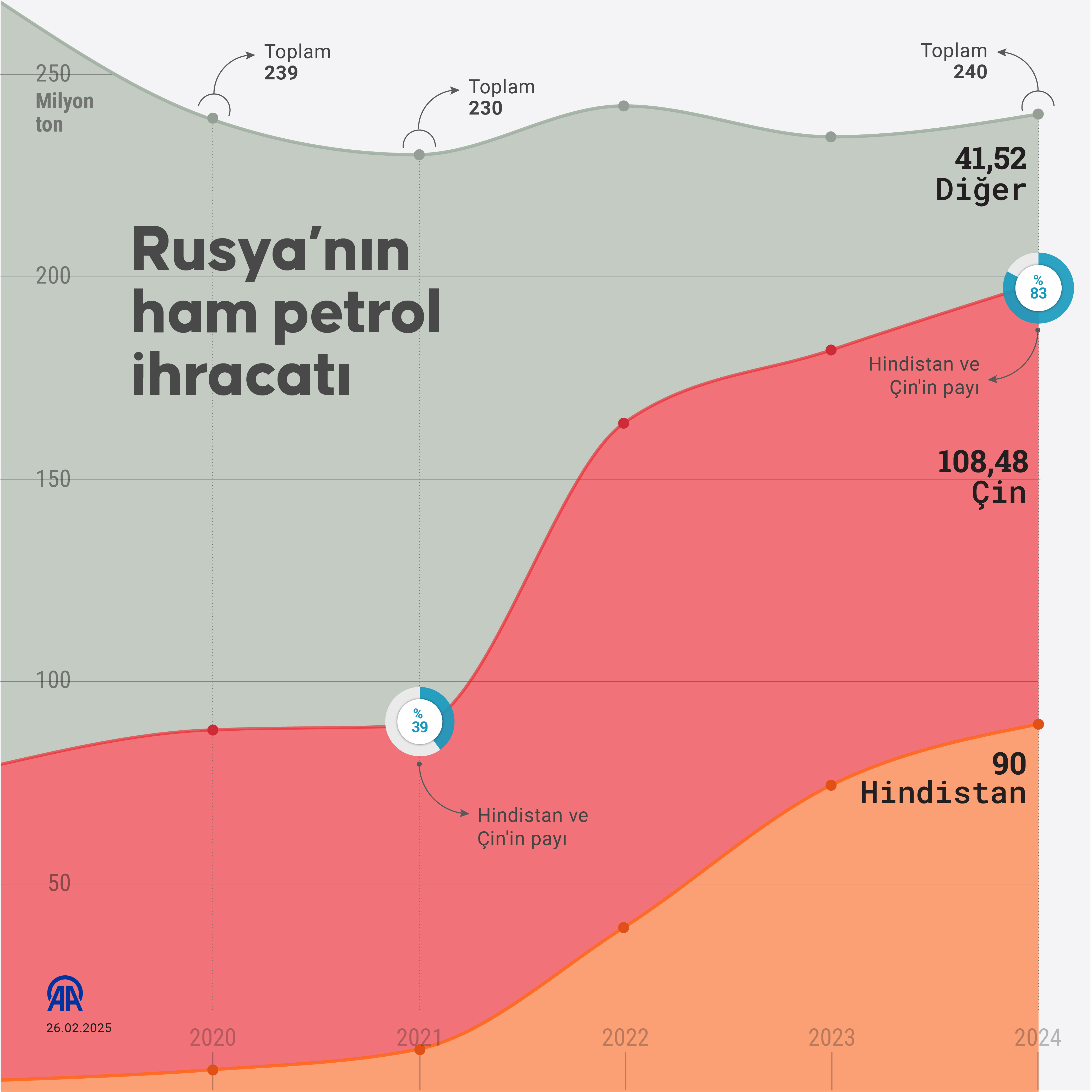 Hindistan ve Çin'in Rus ham petrol ihracatındaki payı, 2021 ve öncesinde yüzde 30-40 civarında seyrederken, bu iki ülkenin Rus ham petrolünün 2022'de yüzde 67,8'ini, 2023'te yüzde 77,6'sını, 2024'te yüzde 83’ünü ithal ettiği belirtiliyor.