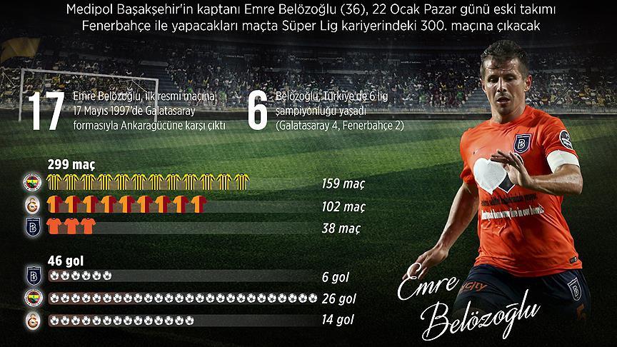 Medipol Başakşehir'in kaptanı Emre Belözoğlu, 22 Ocak Pazar günü eski takımı Fenerbahçe ile yapacakları mücadelede, Süper Lig kariyerindeki 300. maçına çıkacak.