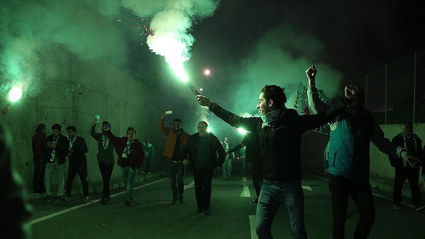 Yeşil-beyazlı renklere gönül verenler, stat çevresinde meşaleler yakıp yine takımları lehine tezahüratta bulunduktan sonra güvenlik güçleri eşliğinde stada giriş yaptı.