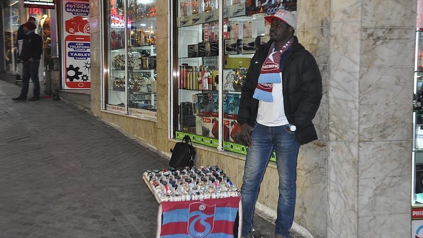 Trabzon'a 3 yıl önce gelen 41 yaşındaki Senegalli İbrahim Sene, saat satarak geçimini sağlarken, Trabzonspor'un maçlarının olduğu günlerde tezgahını açmayarak stada gidiyor.