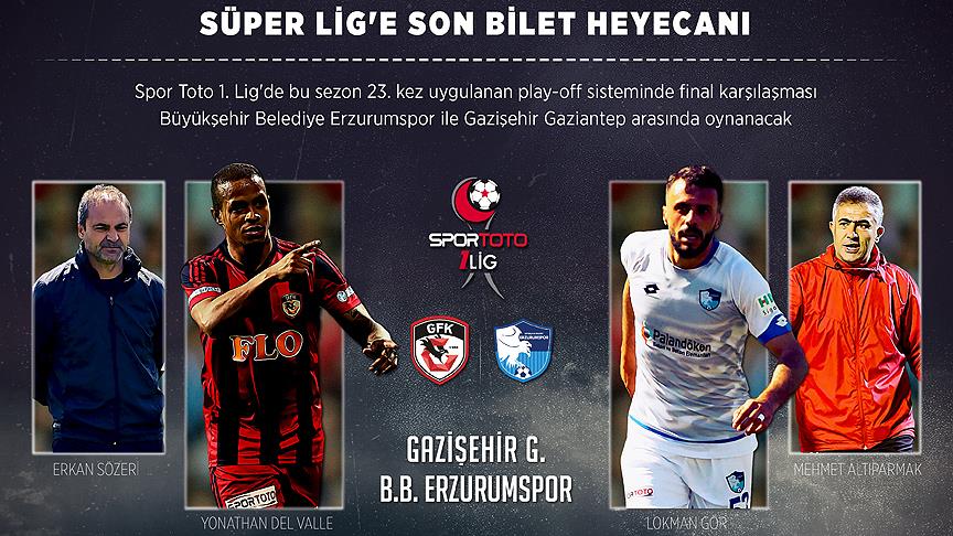 Çaykur Rizespor ve MKE Ankaragücü'nün doğrudan Süper Lig'e yükseldiği Spor Toto 1. Lig'de play-off finalinde Gazişehir Gaziantep ile Büyükşehir Belediye Erzurumspor, Süper Lig'e çıkan 3. ekip olmak için mücadele edecek.