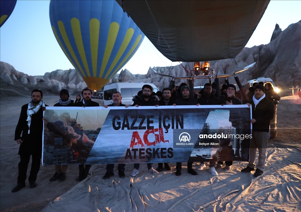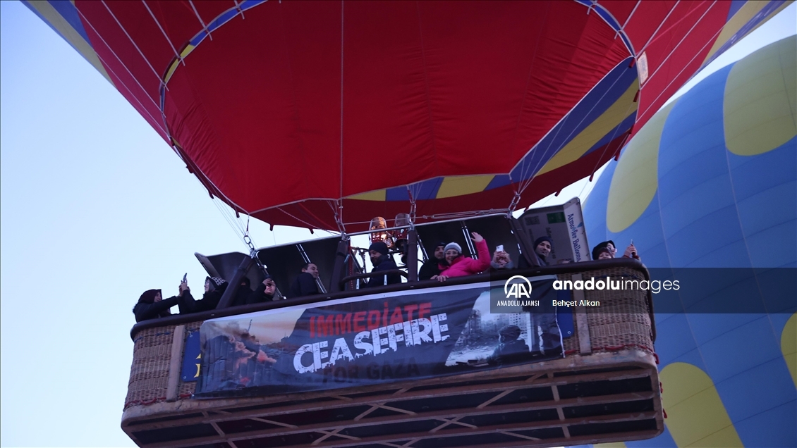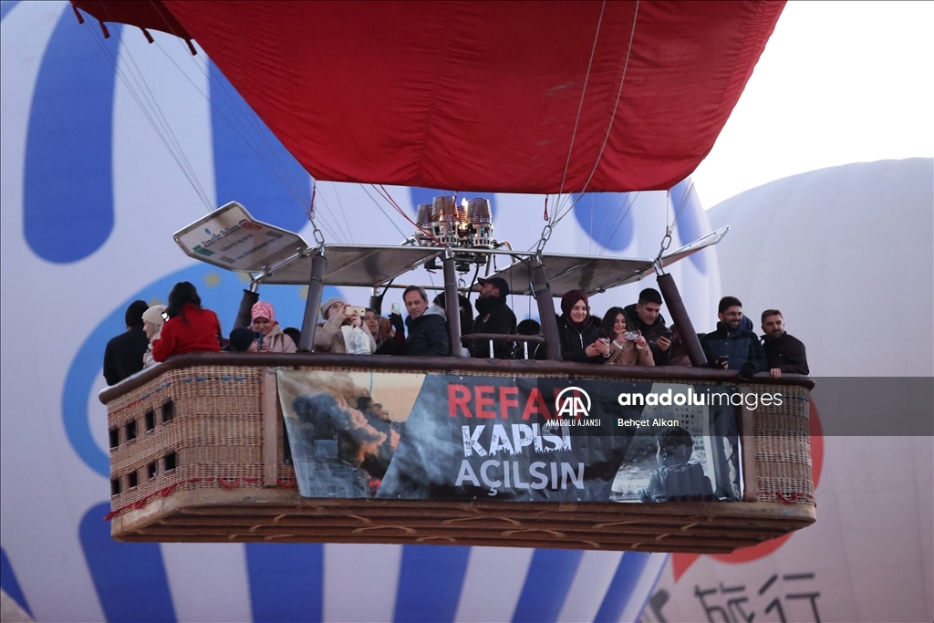 Kapadokya'da turistlere yönelik tur hizmeti veren sıcak hava balonlarının bazılarının sepetlerine, Türkçe ve İngilizce "Gazze'de acil ateşkes" ve "Refah Kapısı açılsın" yazılı afişler asıldı.